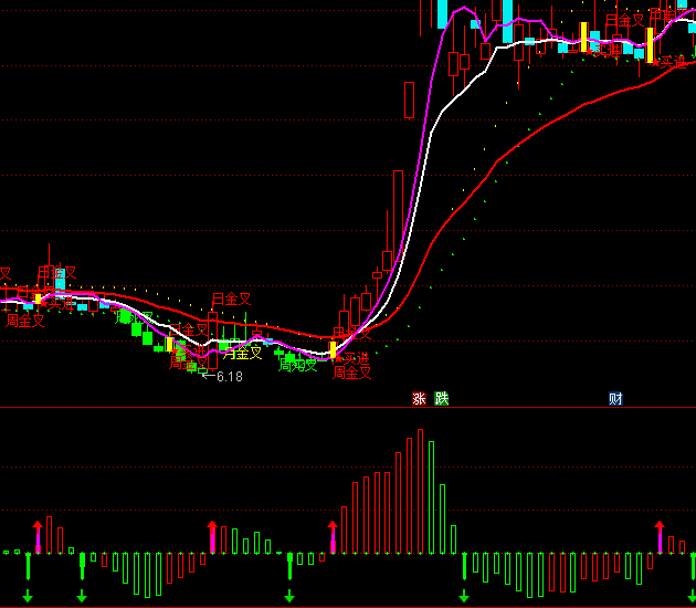 资金进场:IF(CROSS(AA,BB),3,0),STICK,LINETHICK3,COLORFF00FF;