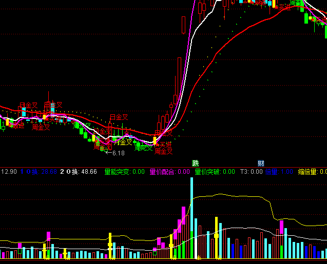 STICKLINE(量能突变,2*V/3,V,3,0),COLORFF00FF;