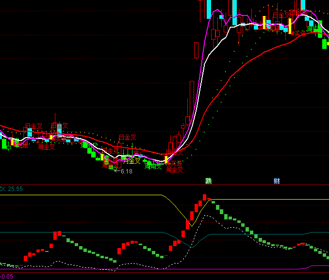 SK89:EMA((V-V21)/(V31-V21)*100,13),DOTLINE;