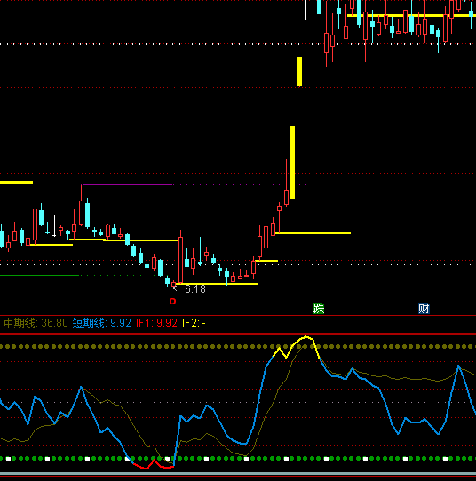 IF2:IF(短期线>=80,短期线,DRAWNULL),COLORYELLOW,LINETHICK2;
