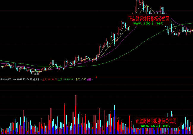 主卖:IF(CLOSE>OPEN,VAR1*((HIGH-CLOSE)+(OPEN- LOW)),IF(CLOSE<OPEN,VAR1*(HIGH-LOW),VOL/2)),COLOR00FF00,POINTDOT;