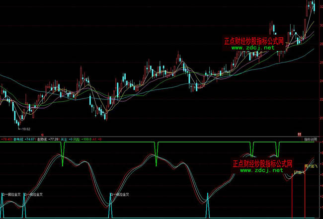风险: IF(CROSS(参考线,移动平均) AND 参考线>75,68,100) , colorgreen,LINETHICK2;