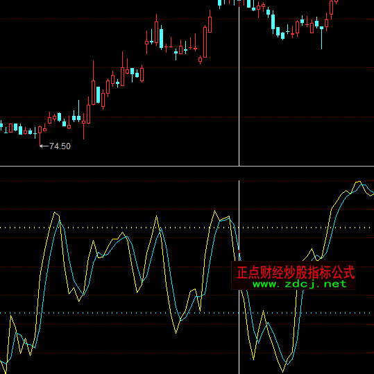 黄线上穿增: EMA((CLOSE-var1)/(var2-var1)*100,P2),coloryellow,LINETHICK1;